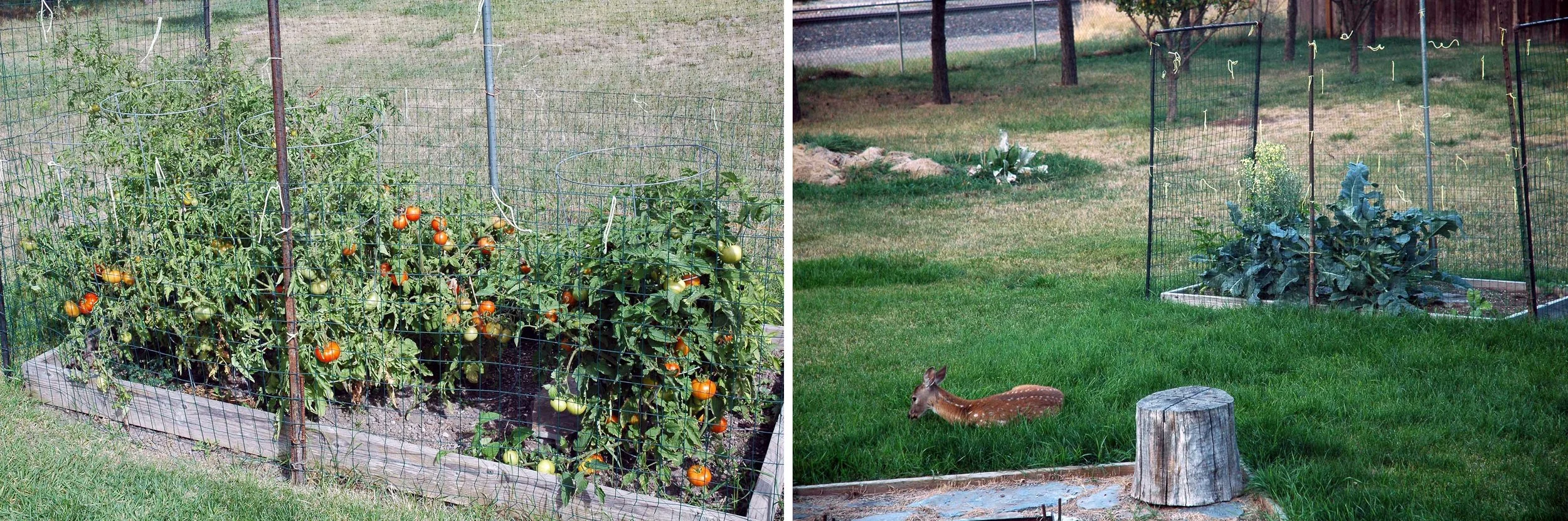 Starting small: we made use of one raised bed and some fencing scraps to grow tomatoes and other veggies, before the yard was fully fenced to keep out deer.